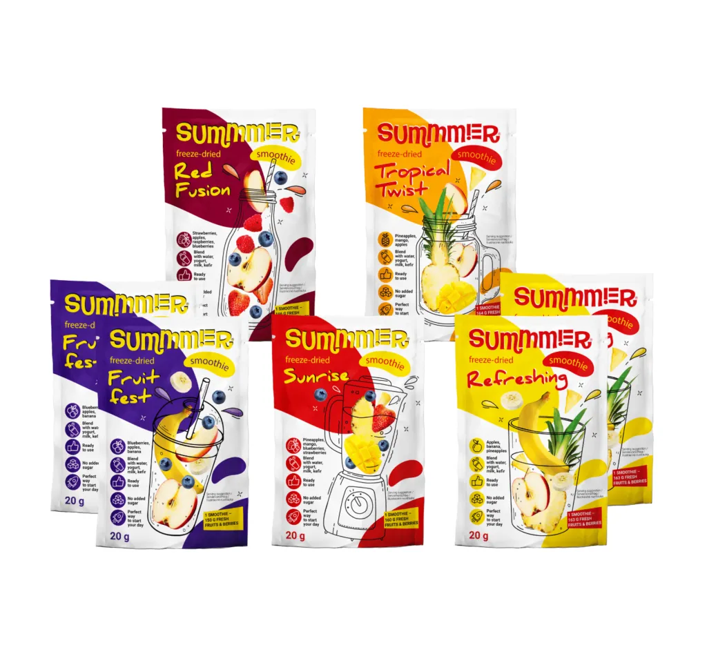 Sudedamosios dalys: braškės, šilauogės, ananasai, mangai.